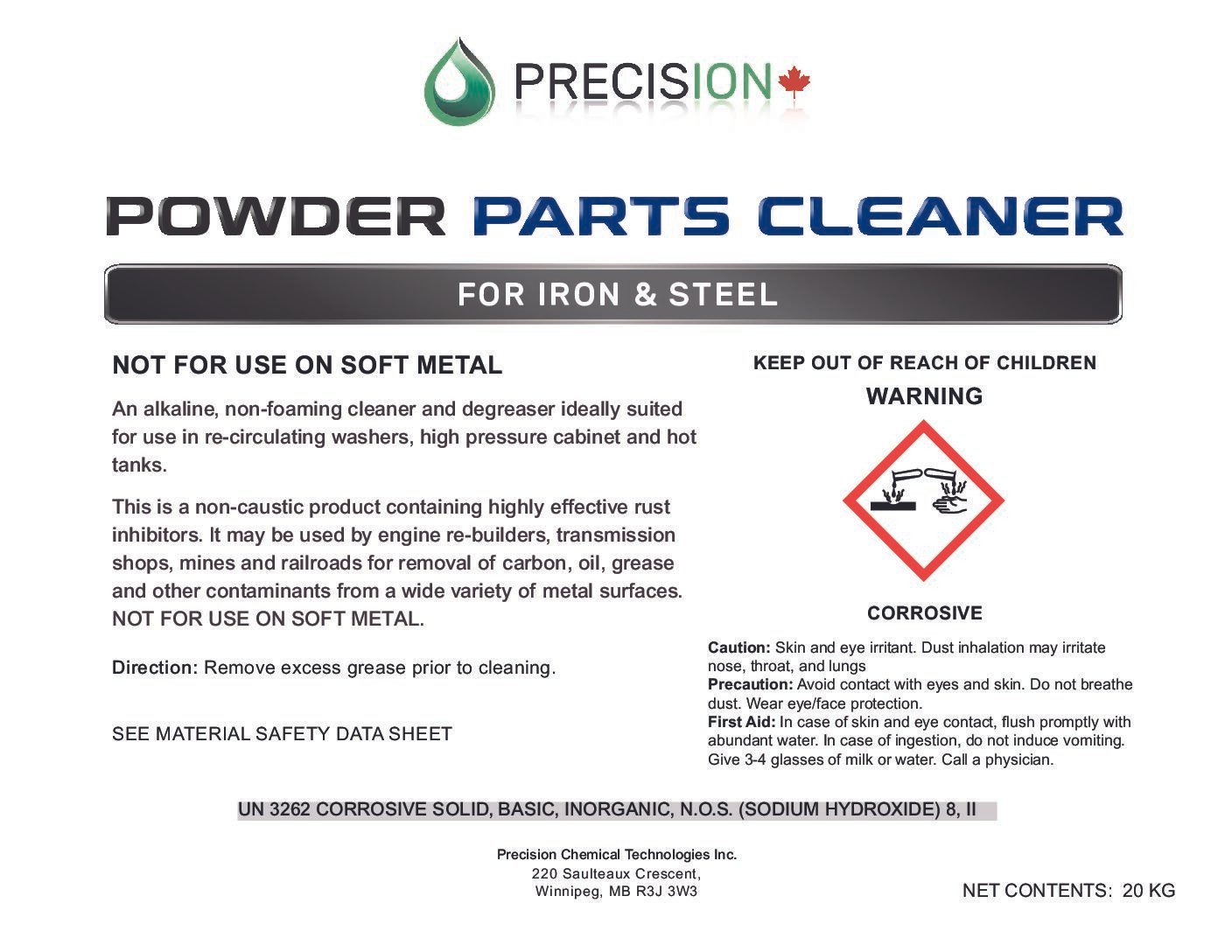 Precision Chemicals Powder Parts Cleaner is an alkaline-based, non-foaming cleaner and degreaser. It contains highly effective rust inhibitors and is non-caustic. It may be used for engine repair shops, transmission shops, mines and railroads. It is formulated for the effective removal of carbon, oil, grease and other contaminants from a wide variety of metal surfaces.